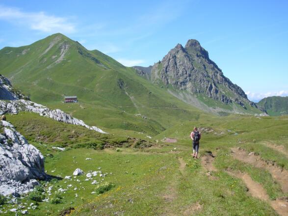 Von der Hütte begeben wir uns zunächst in westl. Richtung bis zu einer Wegteilung, wo es nördl. zur Schwarzen Scharte geht. Hier wenden wir uns nach links (westl.) weiter zum Bilkengrat, einem felsigen Rücken, auf dem wir in engen Kehren (südwestl.) absteigend eine Wegteilung erreichen. Nach Westen über Almböden gelangen wir zuletzt mit geringem Anstieg durch den Porzalengawald zur Lindauer Hütte (lohnend ist eine Besteigung des höchsten der „Drei Türme“, 2830 m,ca. 4 Std. Aufstieg, Trittsicherheit und Schwindelfreiheit!).