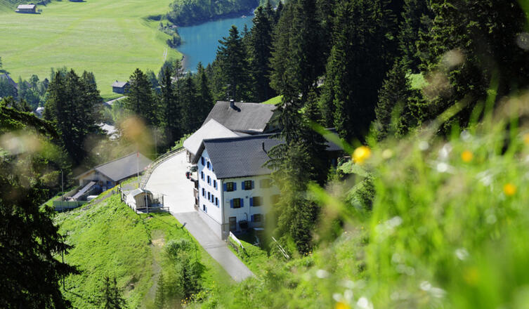 Ansonsten steigen wir links in Serpentinen durch den Wald zur Gafadurahütte hinunter.