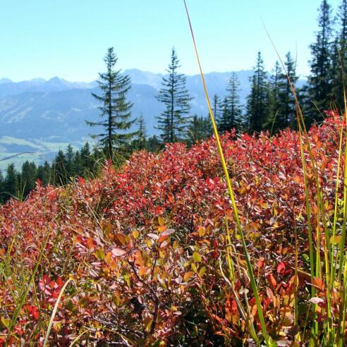Wenn das Braunvieh Mitte September ins Tal getrieben wird und das Geläut der unzähligen Kuhglocken verstummt ist, tritt eine andere Besonderheit der Flyschberge zu Tage. Entlang des Panoramawegs breiten sich an vielen Stellen rote Farbteppiche aus. Es sind Zwergstrauchheiden, die im Sommer nur wenig auffallen.