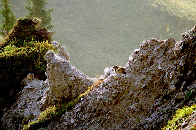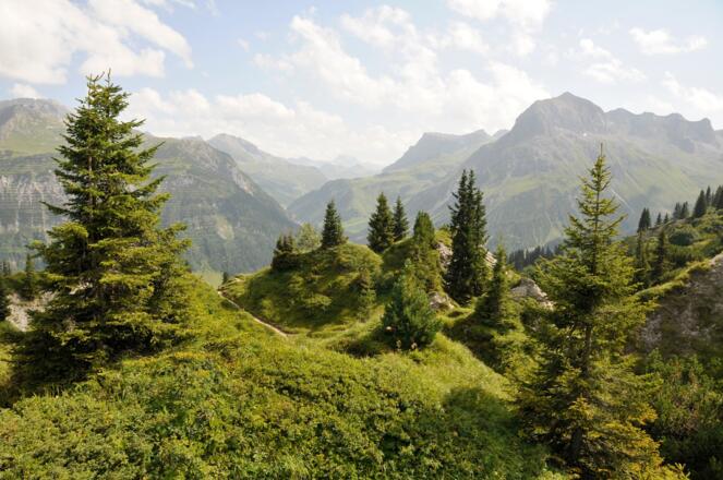 Vor langer Zeit führte eine alte Straße von Mittelberg nach Hochkrumbach, von dort über die Geißbühel und an den Gipslöchern vorbei, weiter über den Tannberg und über Zug hinunter ins Walsertal und von dort nach Feldkirch. Vielleicht liegt es an dieser alten Straße, dass es hin und wieder an den Gipslöchern in der Berger Alpe seltsame Erscheinungen gibt. Manchmal tönt von dort ein sonderbares Jauchzen – und wenn ein mutiger Hirte oder Wanderer diesem Jauchzen antwortet, klingt es so plötzlich aus nächster Nähe, dass bisher alle Reißaus nahmen. Auch tauchen immer wieder zwei weißgekleidete Burschen aus den Löchern auf, denen die Schwerkraft nichts anhaben kann – sie bewegen kaum die Beine und springen doch in Windeseile von der trichterförmigen Vertiefung über den Schneckenrain auf die Parzelle Tannberg hinauf. Ein steiles Gebiet, bei dem die Bauern früher beim Mähen Steigeisen trugen. Natürlich eignet sich der brüchige Gipskarst dieser Gegend für unterirdische Gänge und Höhlen, aber weshalb diese beiden dort unten umgehen und was sie an der Oberfläche treiben, weiß heute kein Mensch. Das ist nicht verwunderlich, denn dieses Geheimnis wird sich erst in ferner Zukunft offenbaren, aus der diese beiden Gestalten nämlich hin und wieder durchscheinen. Wo sie ein- und ausgehen wird ihr zukünftiger Arbeitsplatz sein (das Einkaufszentrum, das sich tief in den Gipskarst erstrecken wird, hat eine ganz besondere Attraktion zu bieten, die hier aber nicht verraten werden soll), und die seltsamen, weißen Gewänder, die man ihnen nachsagt, entsprechen der Mode ihrer Zeit. Ihre erstaunliche Geschwindigkeit basiert auf einer neuen Fortbewegungstechnologie, die schlussendlich auch den lärmenden Autos den Garaus machen wird. Aber das ist alles noch weit entfernt. Dass sich diese Geschehnisse mit dem alten, längst verschwundenen Weg kreuzen, ist kein Zufall – wo irgendwann einmal ein Weg war, werden immer wieder Menschen und andere Wesen angezogen.