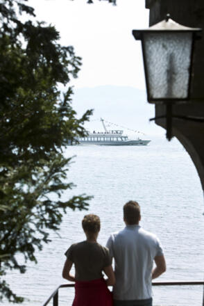 Mit dem Zug bis Haltestelle Wasserburg, von dort 100m Richtung Ortsmitte zum Lindenplatz. Der Ausschielderung auf die Halbinsel folgen.
