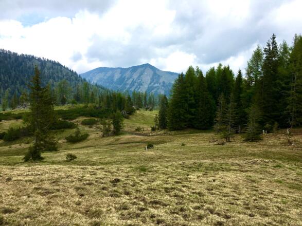 Nun geht der Weg weiter hinauf, vorbei am Hochbühel und den dahinter liegenden Hochwieskopf. Hier wird mit 1680 m der höchste Punkt der Wanderung erreicht. Von nun an führt der Weg stetig bergab. Vorbei an der Hochwies- und der Moosangerlalm, wo nochmals links abgebogen wird hinunter in den Wieslergraben (Wiesleralm), welcher wiederum in den Marchgraben mündet. Die letzten Meter führen wieder entlang des Aubaches zurück zum Ausgangspunkt.