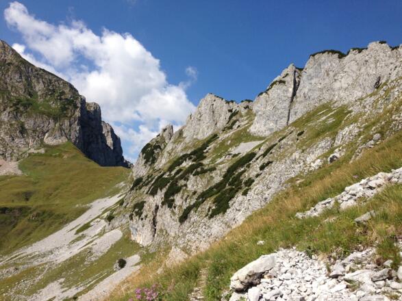 Der kürzeste Weg zum Ausgangspunkt führt über die Variante 27b den Fristabstieg hinunter zur Wandalm, wo man bereits zu Beginn der Wanderung war. Beim Abstieg ist hier besondere Vorsicht geboten.