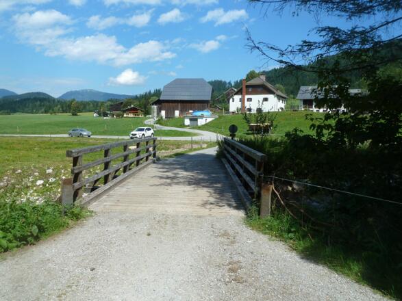 Man geht zwischen dem ehemaligen Gerichtsgebäude und der Bäckerei Hauser und folgt dem Weg 110 bis zum Heimatmuseum im Ortsteil Au (P).