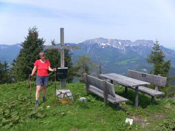 Durch den Schwalberhof geht es auf einem Wiesenweg in den Wald. In vielen Serpentinen schlängelt sich ein schöner Waldpfad über einen steilen Rücken bis zur Dürrfeichtenalm hinauf, wobei mehrmals die Forststraße überquert wird. Eine flache Almstraße führt westwärts in den Eckersattel. Hier wenden wir nach rechts und steigen einen gut befestigten Weg recht steil zur Roßfeldstraße hinauf. Wir überqueren sie und wandern vom Parkplatz zur oberen Ahornbüchsenalm. Ein Steiglein führt in der Westflanke des Almhügels auf den Gipfel des Ahornbüchsenkopfes mit Kreuz und Rastbank. Herrliches Panorama.