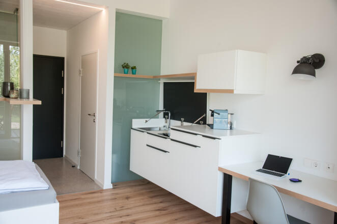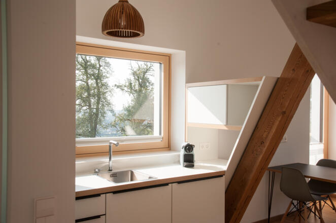 Die meisten Zimmer sind mit einer eigens entworfenen und spezial angefertigten, schwebenden Mini-Küche ausgestattet, welche nach dem Gebrauch mittels Deckel zur Kommode umfunktioniert werden kann. Deckel zu, Küche weg, Wohnen da.