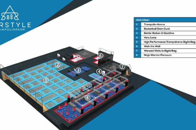 Auf kanpp 1300 qm wird den Gästen ein Fitness- und Fun-Erlebnis der besonderen Art angeboten. Im AirStyle erwarten euch neben einem Ninja Warroir Parkour, Fun-Trampoline, High Performance & Olympische Trampoline, Wallwalk, Basketball, Battle Beam, Slackline und Airbags. Ob Groß oder klein, jung oder alt, Anfänger oder Fortgeschrittener. Hier kommt jeder Besucher auf seine Kosten. Die Kombination aus Sport, Spaß und Lifestyle findet ihr in dem liebevoll eingerichteten Park wieder. Ebenfalls gibt es ein gemütliches Café, das auf regionale und saisonale Köstlichkeiten setzt und durch sein auffälliges Design zum gemütlichen Verweilen einlädt.