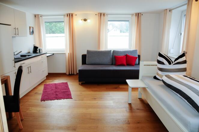 Komplett renovierte und liebevoll neu ausgestattete Appartements für 1 - 4 Personen im Herzen der Gemeinde Lachen. Diese liegt im schwäbischen Landkreis Unterallgäu, 10 km südöstlich von Memmingen, 33 km von Kempten und ca. 78 km vom Bodensee entfernt. In unserem stilvollen Altbau sind insgesamt 4 moderne Appartements und ein Einzelzimmer entstanden. Jedes Appartement verfügt über einen modernen Küchenbereich (bis auf das Einzelzimmer) mit Ceran-Kochfeld sowie Kühlschrank mit Gefrierfach. Ein naturbelassener Holzboden mit Oberflächen-Beölung aus Naturöl sorgt für angenehmes Fußgefühl. Lassen Sie sich von der raffiniert ausgewählten Einrichtung in diesen Appartements begeistern und fühlen Sie sich wie zuhause.