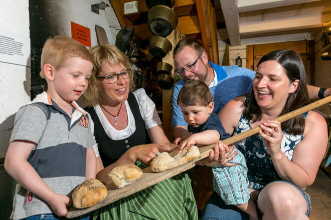 Zu sehen ist der historische Sattler-Hof, der bewirtschaftete Museumsbauernhof mit Tieren, begehbarer Kuhmagen, und die Historische Höfle-Alpe mit Sennküche.