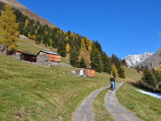 Vom Hotel Tauferberg durch den Ort Niederthai bis zum Hotel Falknerhof. Dort zweigt man auf einen Forstweg (Richtung Larstighof, Grastal) ab. Stetig ansteigend erreicht man nach ca. ½ Stunde die Bergwiesen Grastalfeld. Weiter führt der Weg bis zur Jausenstation Larstighof. Von hier führt der Weg weiterhin leicht ansteigend bis zur Kleinhorlachalm. Ca. 100m hinter der Alm zweigt man links auf einen etwas steileren Pfad ab und erreicht die wunderschön gelegene Finstertaler Alm (2.147m). An der Alm überquert man den Bach und ein herrlich angelegter Weg führt weiter flach durch einen Zirbenwald zur Schweinfurter Hütte. Der Rückweg führt zuerst über Weideflächen und Forstweg bis zum Larstighof. Von dort noch ca. 500m am Bach entlang – über eine Brücke zweigt man rechts ab auf den Bergmahder Weg - zuerst kurz und steil ansteigend, anschließend abwärts zurück nach Niederthai mit herrlichem Blick auf die 3.000er des Ötztaler Geigenkammes.