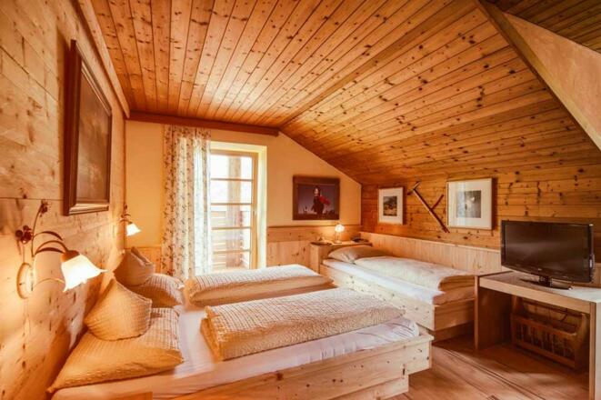Zimmer mit natürlichem Baumaterial schaffen ein angenehmes Raumklima und sorgen mit der klaren und frischen Bergluft für hohe Schlafqualität. Die "Adlerhorst-Zimmer" bieten einen großen Südbalkon.