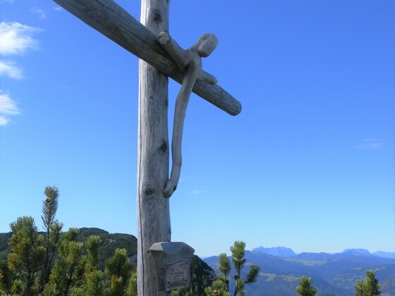 Direkt bei der Bergwerkszufahrt zweigt links ein steiler Schotterweg ab. Ihm folgen wir bis zur ersten Verzweigung. Links könnte man laut Karte ebenfalls ansteigen, wir bleiben rechts auf dem immer sehr steilen Forstweg, der nach mehreren Kehren endet. Ein zuerst unmarkierter schmaler Pfad windet sich nun am steilen Hochwaldrücken bis zum Felsfuß des Alphorns hinauf. Vereinzelte Steinmänner und schwache Markierungen helfen nun bei der Orientierung in den schrofendurchsetzten, steilen Grashängen. Ein Felsriegel wird links umstiegen, danach folgt eine lange, meist gehörig exponierte Querung entlang des Nordwandfußes. Beim Marterl mit Steigbuch wird links eine altseilgesicherte Felsrinne erkraxelt, ein Stockwerk höher dann wieder rechts am Felsfuß entlang gewandert. Eine Schrofenstufe wird überkraxelt (roter Pfeil) eine Felsschlucht gequert, eine feuchte Felsrinne (altes Sicherungsseil) in die grasige Steilmulde, die zum Laufsattel hinaufführt, durchklettert. In kurzen Kehren wird die latschenbewachsene steile Schrofen-Grasrinne (nicht mehr exponiert) bis zum Laufsattel angestiegen. Hier zweigt der gerade erkennbare, unmarkierte Pfad links auf den Westrücken des Alphorns ab. Im Latschendickicht geht es in kurzen Kehren (einmal durch einen Baumwurzeldurchschlupf) schnell zum latschenbewachsenen Südrücken mit Watzmann- und Hochkalterblick hinauf. Links führt eine breite, schrofige Latschengasse fast eben nordwärts zum kleinen Gipfelkreuz des Alphorns mit schönem Panoramablick vom Kaiser bis zum Göll.