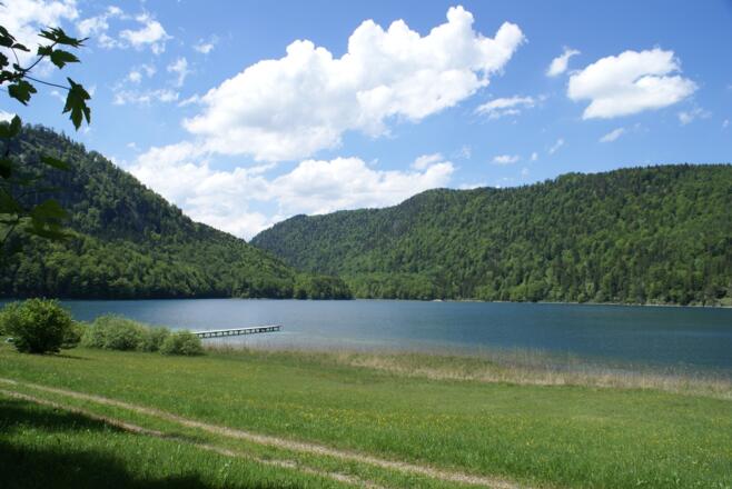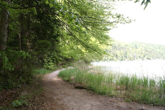 Der Alpsee ist das klarste Gewässer rund um Schwangau und war der Lieblingssee von König Ludwig II. Los geht’s am Alpseeparkplatz auf der Fürstenstraße in Richtung Schloss Hohenschwangau bzw. Österreich. An der Abzweigung rechts zum Schloss Hohenschwangau führt der Weg geradeaus weiter. Der Pindarplatz linker Hand bietet einen tollen Ausblick über den See in Richtung Schloss Neuschwanstein und zum Museum der bayerischen Könige. Ein Stück oberhalb halten Sie sich links und nehmen den schmalen Weg zur Seeumrundung abseits der geteerten Straße, bis sie eine Lichtung mit dem Marienmonument erreichen. Früher war die Stelle der bevorzugte Badeplatz von Königin Marie. Die römischen Ziffern MDCCCLIIIL markieren das Baujahr des Monuments 1897, die Buchstaben I.V.S. verweisen auf die Stifter, die Adeligen von Seinsheim. Die Lichtung ist ein guter Ort, um Pause zu machen, die Seele baumeln zu lassen und die Aussicht zu genießen. Danach geht es in Richtung Alpseebad, das Sie vorbei an Felsen und über Stege am anderen Ufer erreichen. Nun ist es nicht mehr weit zum Ausgangspunkt.