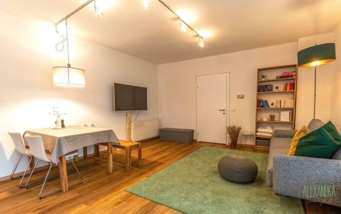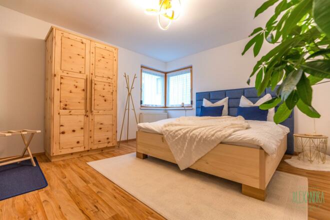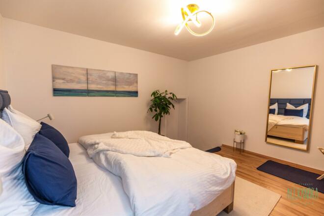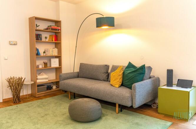 Die Wohnung liegt mitten in Gmunden ein paar Gehminuten von der Esplanade am Traunsee entfernt. Sie ist ruhig gelegen und fällt durch eine ungewöhnliche Aufteilung auf. Begrüßt wird man durch eine rote Treppe die ins geräumige Schlafzimmer führt. Dieses ist ausgestattet mit Zirbenmöbeln, die einen angenehmen Duft verströmen. Weiter führt die Treppe hoch ins Bad, das komplett neu renoviert wurde und mit einer Regendusche ausgestattet ist. Die Toilette ist separat.