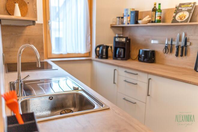 In der voll ausgestattete Küche können Sie nach Gusto kochen, alle Geräte von Backofen über Spülmaschine sind vorhanden.