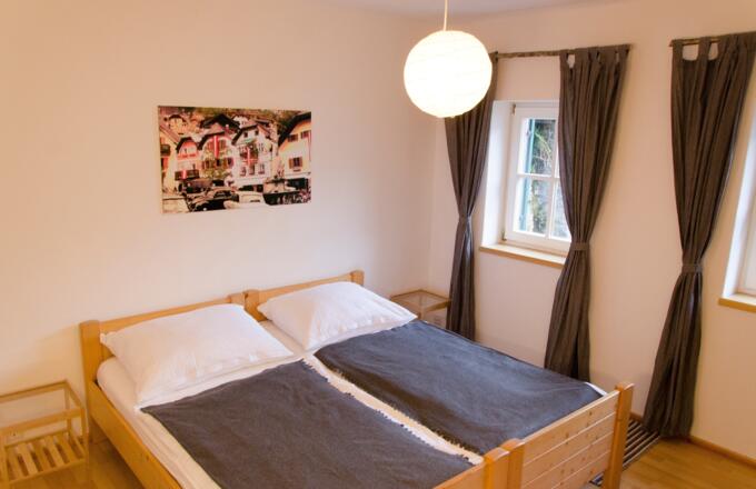 Das große Schlafzimmer mit 2 Einzelbetten die zu einem Doppelbett zusammengestellt werden können, bietet Blick auf den Hallstättersee.
