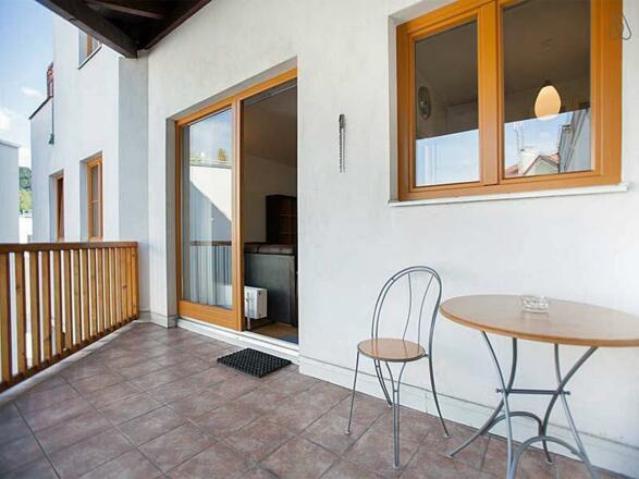Raucher benutzen den großen, sichtgeschützten Balkon, mit Blick in den ruhigen Innenhof.