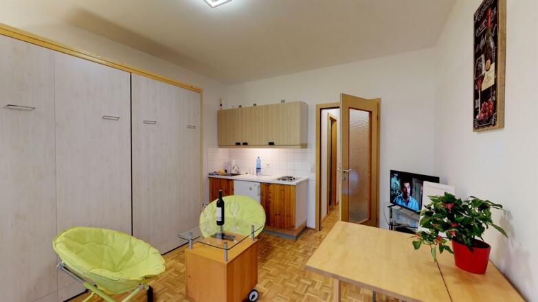 In der Wohnküche befindet sich ein ausklappbares Kastenbett und eine Küchenzeile.