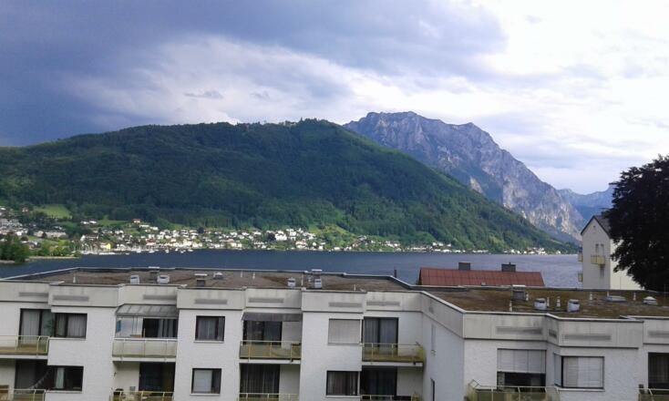 1,5 Stockwerke unterhalb befindet sich ein großer allgemeiner Balkon mit wunderbarem Panoramblick auf den Traunsee und das Gebirge.