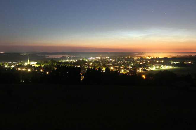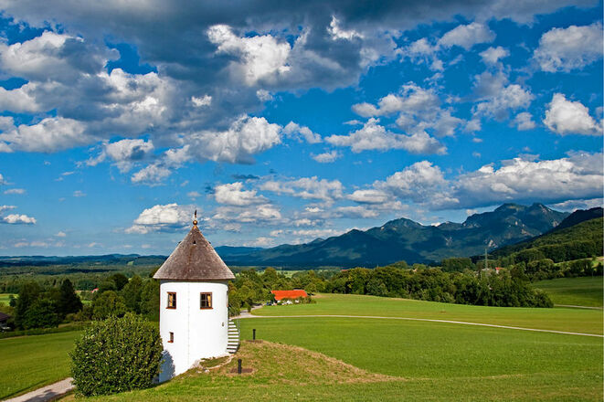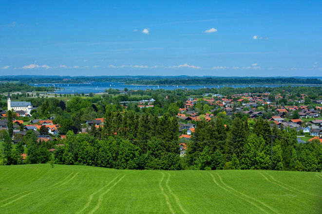 Vom historischen Wasserturm im Bernauer Ortsteil Bergham genießen Sie einen der schönsten Ausblicke auf Bernau und den Chiemsee mit Herren- und Fraueninsel.