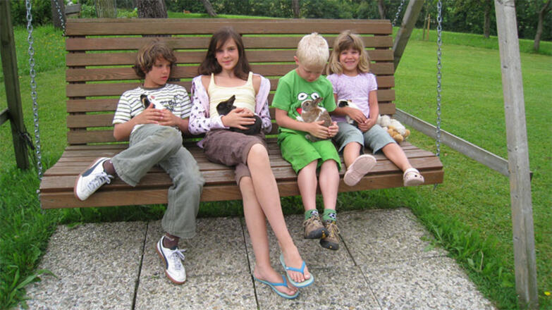 Erleben Sie den Bauernhof mit unseren Kühen, Kälbern, Hühnern, Hasen und Katzen. Wir bieten Ihnen auch die Möglichkeit, aktiv daran teilzunehmen.