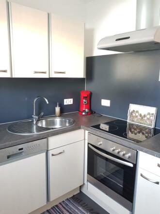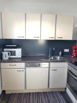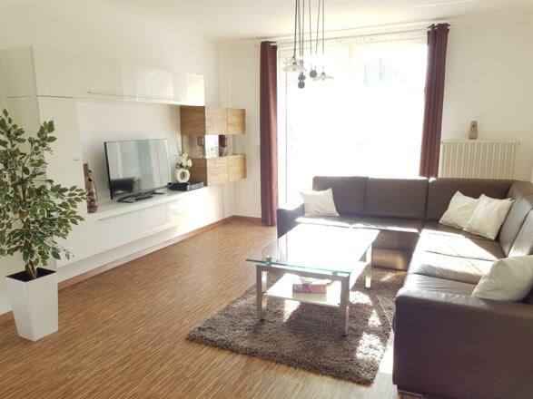 Zur gemeinsamen Verwendung stehen ein geräumiges Wohnzimmer, Essbereich und eine vollausgestattete Küche zur Verfügung.