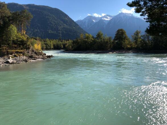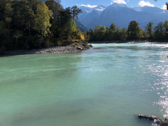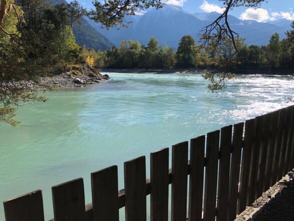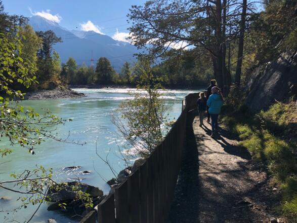 Man hält sich nach der Brücke links und spaziert in den Ort Schlierenzau. Der kleine Weiler liegt malerisch am Wiesenrand. Über eine Hängebrücke gelangt man wieder auf das südliche Ufer des Inns und in den Ort Riedern. Durch den Nadelwald wandert man auf einem flachen und breiten Weg zurück nach Haiming.