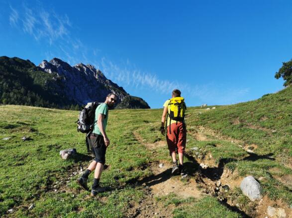 Über eine kleine Holzbrücke folgen wir den Schildern rechts den Berghang hinauf. Wir passieren die Ochsenwaldalm und gelangen über eine Kapelle zum Arlinger Sattel (1425m), dem Ausgangspunkt des kurzen Klettersteiges. Seilversicherte Klettereien wechseln sich mit Gehpassagen ab. Am Sattel der Frauenmauer (1843m) lädt die mythische Wildfrauenhöhle zu einem Abstecher ein. Beim Gipfelkreuz des Bosruck (1992m) können wir das Klettersteigset wegpacken. Mit sagenhaftem Rundumblick wandern wir dem Kamm entlang über den Kitzstein (1925m) bis hin zum Lahnerkogel (1854m). Von dort geht es serpentinenartig hinab, vorbei an Lawinenverbauungen, bis wir die Fuchsalm erreichen. Am Pyhrnbach entlang neigt sich unsere schöne Überschreitung gemütlich dem Ende zu.
