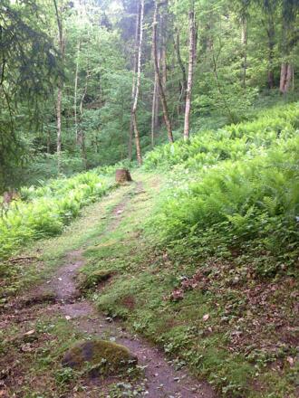 in einigen Serpentinen durch schattigen Mischwald am Nordhang