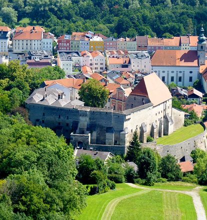 Auf einer geographisch günstigen Anhöhe, direkt am Ponlachgraben, thront über der Stadt die mittelalterliche Burg. Ihre strategische Lage auf dem Geländesporn und ein tiefer Halsgraben erschwerten eine Eroberung. Zusätzlich waren früher beide Burgtore nur über Zugbrücken passierbar.