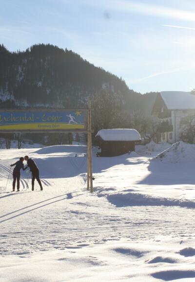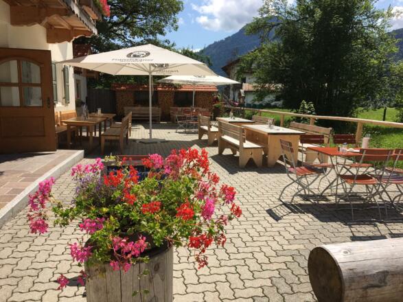 Modernes Café mit schönem Biergarten im Sommer und direktem Loipeneinstieg und Langlaufskiverleih.