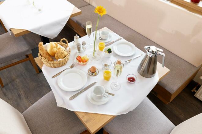 Unser reichhaltiges Frühstücksbuffet – an dem Sie eine große Auswahl an frischen, regionalen Brot-, Wurst- und Milchprodukten vorfinden – können Sie in angenehmer Atmosphäre nach Herzenslust genießen. Eine Müsli- und Nussecke, frisches Obst der Saison, Honig und Marmeladen runden Ihr Frühstücksangebot ab.