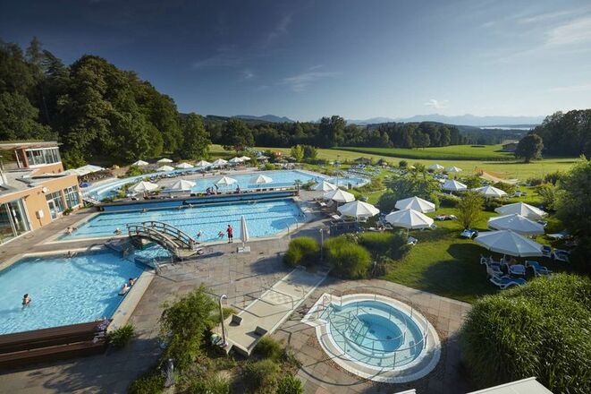 - In der Thermenlandschaft können die Gäste verschiedene Innen- und Außenbecken nutzen bei Wassertemperaturen bis zu 34°C Grad: Die neue FELS LAGUNE (Innenbecken) mit Wasserfall in der Felsgrotte, Hexenkessel, Massagedüsen, zahlreichen Sprudelliegen und -bänken begeistert Erholungssuchende. Der Außenbereich bietet ein Relaxbecken, ein Sommer-Aktiv-Becken, einen Whirlpool, einen 125 Meter langen Strömungskanal, ein Kneipp-Tretbecken und eine Panorama-Liegewiese - das alles mit einem atemberaubenden See- und Bergblick.