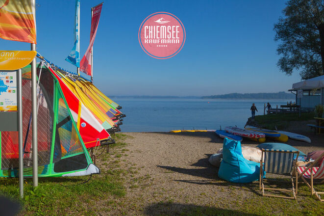 Die Chiemsee-Surfschule bietet neben Kursen auch einen Verleih für Boards, Riggs, SUPs, Neoprenanzüge und Trapeze und einen Surf-Shop.