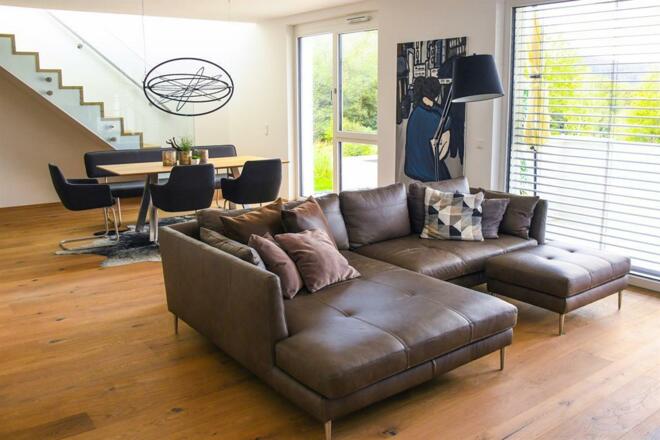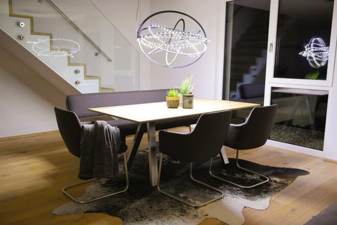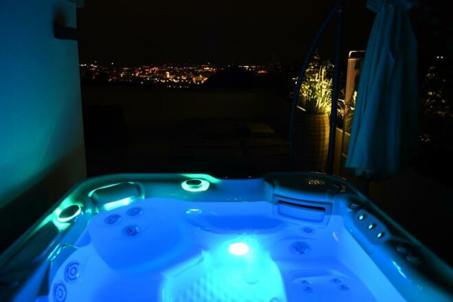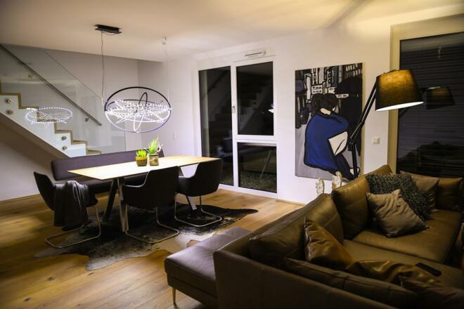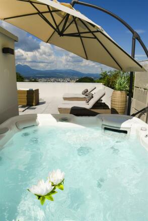 Unsere Räumlichkeiten sind mit hohem Komfort eingerichtet: Boxspringbetten, Whirlpool auf der Dachterrasse mit Blick auf Salzburg, 2 Bäder mit Doppelbadewanne/Walk-in-Dusche, 2 TV-Screens, Soundbar, Nespresso-Kaffeemaschine, vollausgestattete moderne Küche mit Miele-Geräten, stilvoll eingerichteter moderner Wohnbereich mit großer Sitzgruppe und vieles mehr. Die Wohnung ist direkt über die Tiefgarage per Lift erreichbar (2 TG-Plätze mit jeweils Stromanschluß).