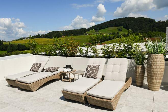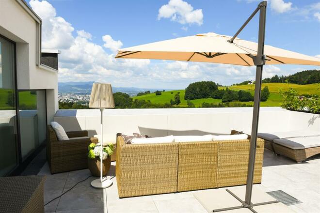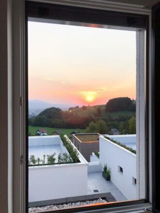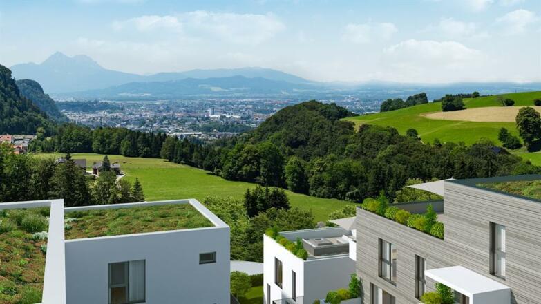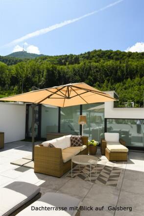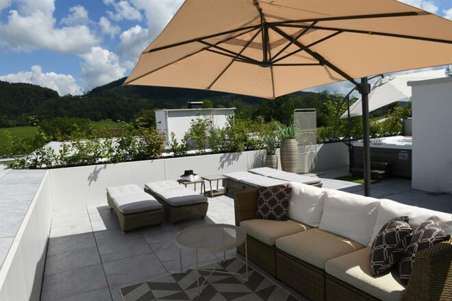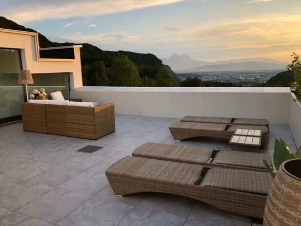 Genießen Sie laue Sommerabende auf der Dachterrasse und erleben Sie im Winter den Blick auf die verschneite Landschaft sowie die freie Sicht auf Stadt und Land Salzburg!