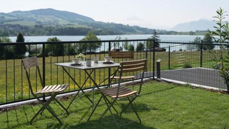 Seeleben 46 - das kleine, feine Ferienhaus am Irrsee mit herrlichem Blick auf dem See, auf Wiesen und auf Wälder.