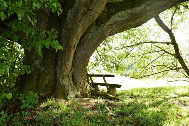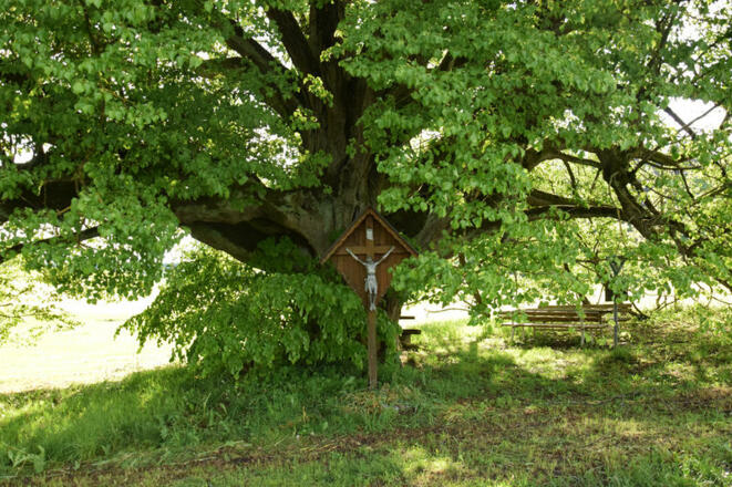 Die mächtige über 300 Jahre alte Krieringer Linde ist eine besondere Schönheit. Unter dem Blätterdach des uralten Baumes lädt eine Bank zur Rast ein.