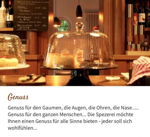 Kulinarisch bietet die Spezerei ein herausragendes Angebot an ausgesuchten Spezialitäten wie: