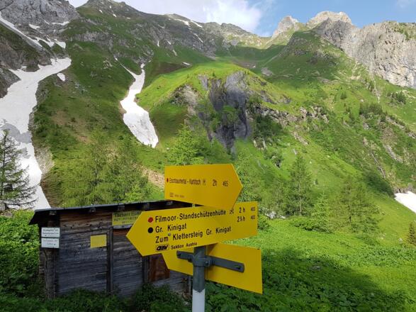 Vom Gipfel ganz kurz Richtung Westen absteigen und dann markant auf der Rampe (A bis B) zum Wandfuß. Von dort in östlicher Richtung über den Wanderweg zur Filmor-Standschützenhütte
