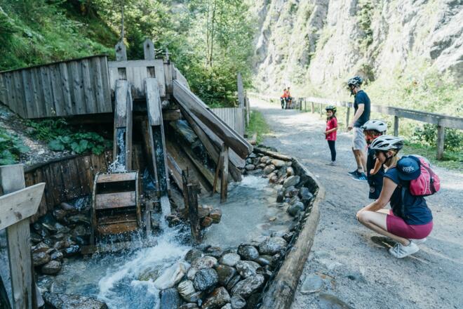Der asphaltierte Uferbegleitweg bringt Sie fernab jeden Verkehrs zügig weiter durchs Pustertal. Einmal quert die Route die zufahrt eines Schotterwerkes. Kurz nach dieser Zufahrt steigert sich das Flussgeräusch der Drau zu einem tosenden Rauschen: Ein Wehr mit darüber führendem Steg hält die Wassermassen kurz zurück, um sie dann mit geballter Vehemenz weiterzuschicken.