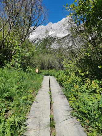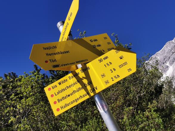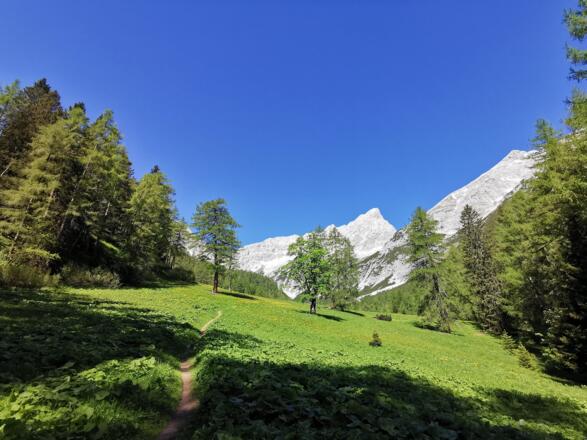 Hier folgen wir den Schildern Richtung Issanger/Lafatscherjoch über Hirschbadsteig über den Bach. Zwischen Latschen geht es immer weiter hinein auf einem schönen Steig bis wir auf die Lichtung des Issangers treffen. Der Blick der sich hier vor uns auftut, ist atemberaubend. Umrahmt von den Karwendelbergen betreten wir das Blumenparadies Issanger.
