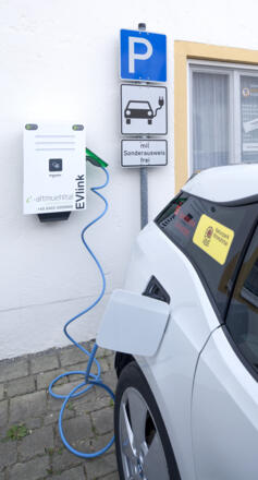 Elektroautoladestation mit einem öffentlichen Typ 2 Ladepunkt. Die Autosierung erfolgt mittels gängigen RFID-Ladekarten.