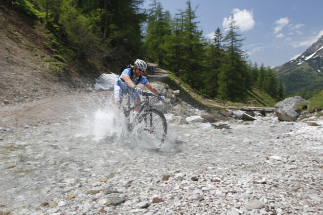 Von der Information (Altenmarkt-Zauchensee Tourismus) einen Teil des Ennsradweges Richtung Eben. Danach rechts abbiegen in Richtung Filzmoos (ca. 11 km). Beim Filzmooser Kreisverkehr rechts Richtung Ramsau - nach 1,7 km Abzweigung nach rechts auf Schotterstraße über Brücke, der warmen Mandling entlang bis zum Stausee - weiter links haltend Richtung Auwirt und auf der Straße bis Ramsau (bis Ramsau leicht) - vor dem Ortszentrum links abzweigen Richtung Gasthof Edelbrunn und über das Dachsteinhaus bergauf zur Austriahütte - Türlwandhütte zur Dachstein-Gletscherbahn.
