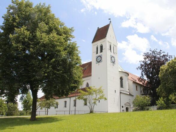 Die ehemalige Klosterkirche wurde im 12. Jahrhundert unter Abt Heinrich I. als eine der ältesten romanischen Backsteinbauten auf der bayerisch-schwäbischen Hochebene errichtet. Das Äußere der Kirche ist trotz Barockisierung (um 1714) eher schlicht. Ihr inneres Erscheinungsbild prägen heute die Fresken (1764) des Augsburger Malers Franz Joseph Maucher sowie die sparsam gesetzten Stukkaturen (1762-1765) wohl von Franz Xaver II. Feichtmayr.