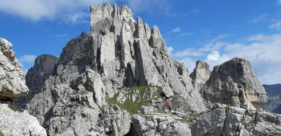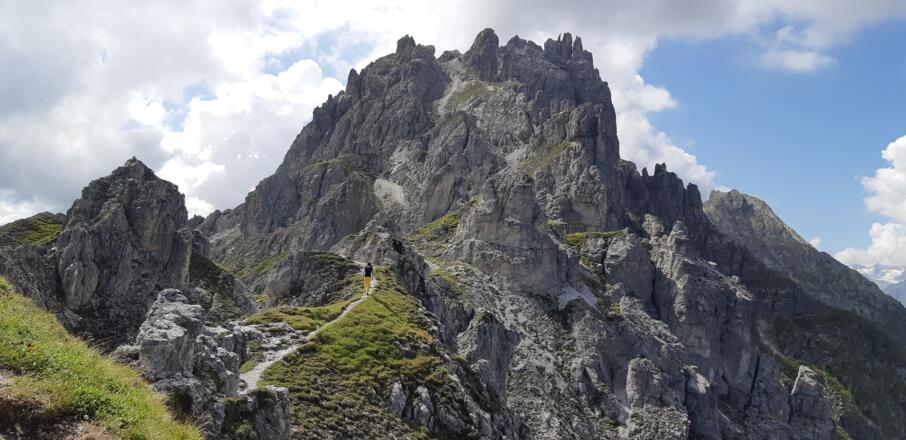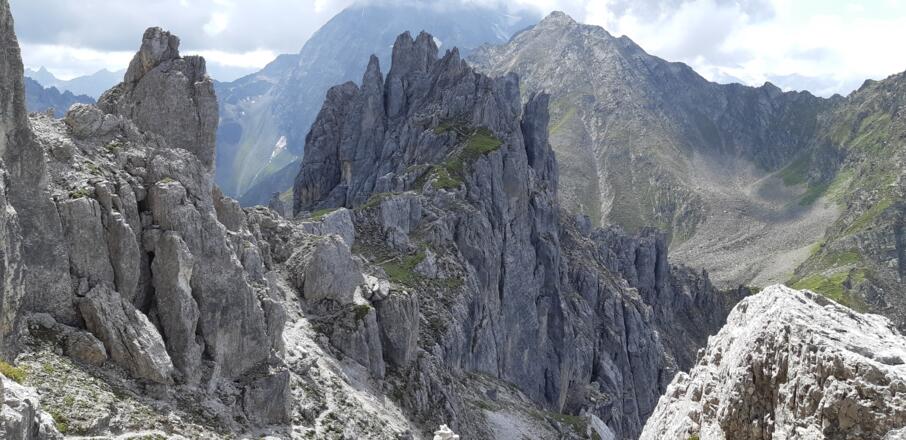 Toller Gratklettersteig in den Stubaier Alpen, der sich in Dolomitenart zwischen unzähligen Felstürmen durchzieht.