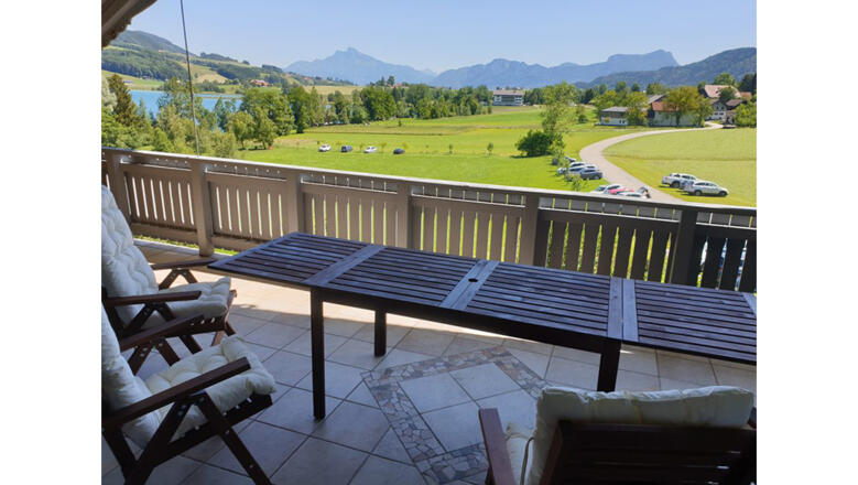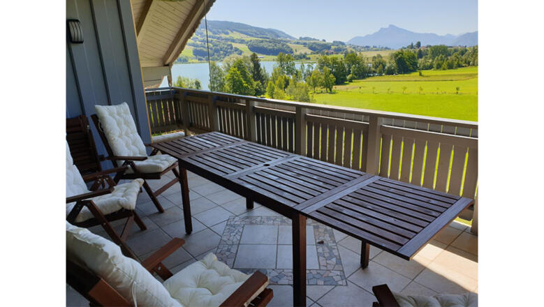 ausgestattete Ferienwohnung mit Panoramablick über den See und die Berge.