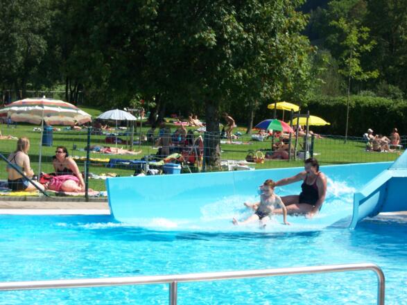 Eine 52 Meter lange Erlebnisrutsche, 800 m² Wasserfläche und rund 5000 m² sonnige Liegewiese, die umgeben ist von schattenspendenden Bäumen – Badespaß für Klein und Groß