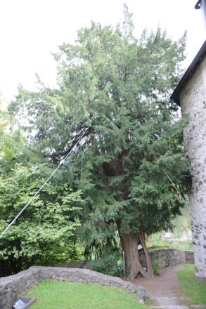 Auf der anderen Seite des Hügels steigen wir zur St.-Corneli-Kirche ab, wo sich eine erste Rast anbietet (Bank mit Brunnen, Gasthaus). Vorbei am Naturdenkmal „Tausendjährige Eibe“ geht es wieder bergauf zum Weiler „Auf der Egg“, dort ebenfalls Einkehrmöglichkeit.