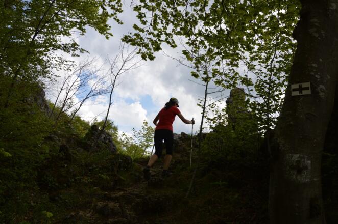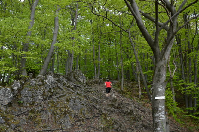 Teilweise luftiger "Grat"-Anstieg von Muggendorf im Wiesenttal hinauf zum höchsten Punkt des "Muggendorfer Gebürgs", zum Aussichtsturm Hohes Kreuz.